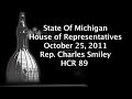 State Representative Charles Smiley (Burton) speaks to House members on Oct. 25, 2011 on House Concurrent Resolution 89 which urges the U.S. Department of Defense to apply uniform standards when awarding the Purple Heart so that it applies to individuals with traumatic brain injuriesdemocrats qualified for next debate Rep. Smiley speaks regarding HCR 89 | |